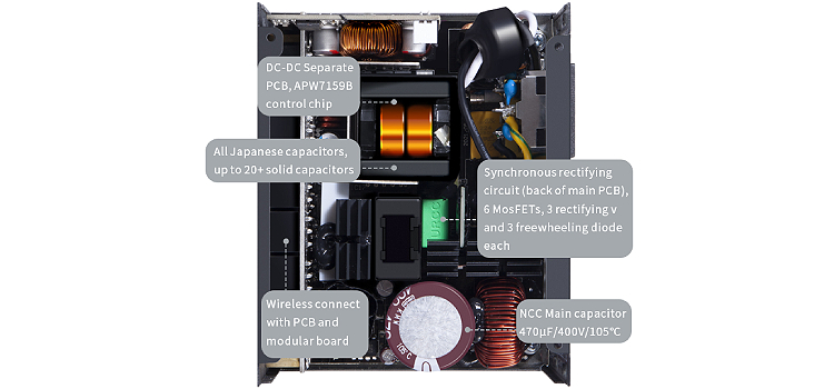 ספק הכוח 1STPLAYER SFX משתמש בקבלים אלקטרוליטיים יפניים אחרים של Rubycon, NCC, Nichicon, קבלים ראשיים בעלי קיבולת גבוהה וקבלים מוצקים.