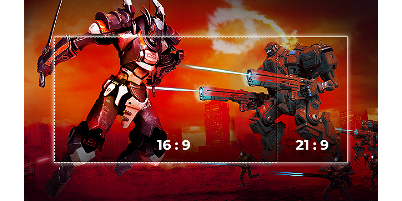 יחס הגובה-רוחב של מסך רחב של 21:9 מושלם לצפייה בסרטים בפורמט רחב ללא הפסים השחורים בחלק העליון והתחתון של המסך.