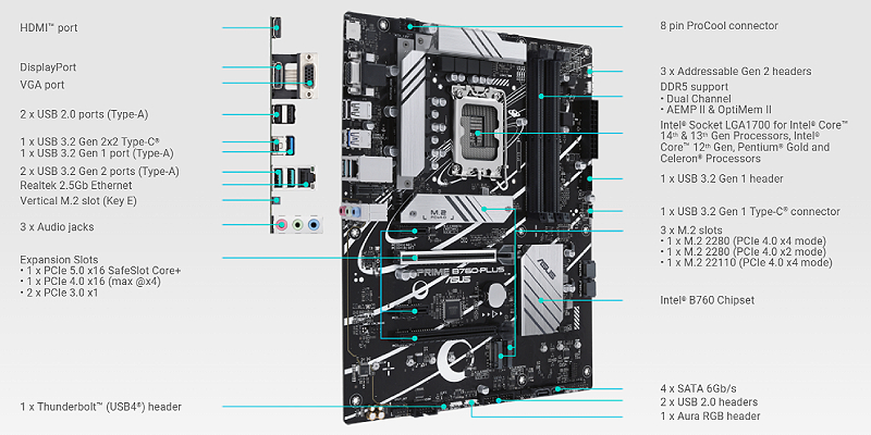 קישוריות מהירה במיוחד: PCIe 5.0, three PCIe 4.0 M.2, Realtek 2.5Gb Ethernet, USB 3.2 Gen 2x2 Type-C®, front USB 3.2 Gen 1 Type-C® and Thunderbolt™ (USB4®) header support