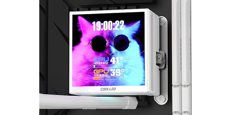 קירור נוזלי למעבד ICE Apex Vision 360 WT מבית Coolleo, בצבע לבן, עם מסך IPS ברזולוציה של ‎480×480‎, שטח תצוגה גדול וחד יותר, תמיכה בערכות נושא מותאמות אישית, העלאות בפורמטים שונים וניגון וידאו. ICE-APEX-VIS-360-WT