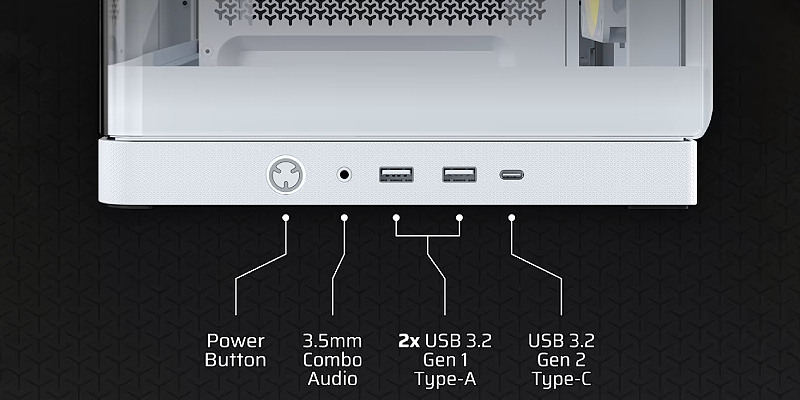 כולל חיבור USB 3.2 Gen 2 Type-C, שני חיבורי USB 3.2 Gen 1 Type-A, ושקע משולב לאוזניות/מיקרופון.