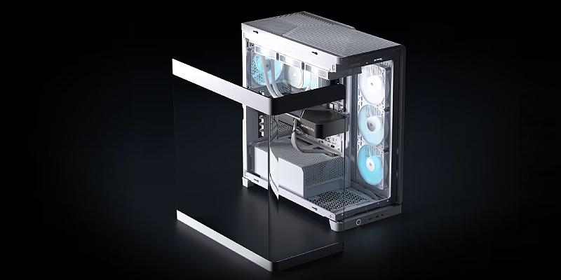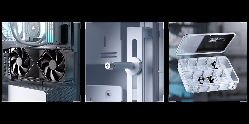 מצויד בשלושה מאווררי RS-R ARGB עם סיבוב הפוך (Reverse) ושליטה ב-RGB, זרוע ייצוב נגד שקיעה לכרטיס גרפי, ותאימות ללוחות אם עם מחברים הפוכים.