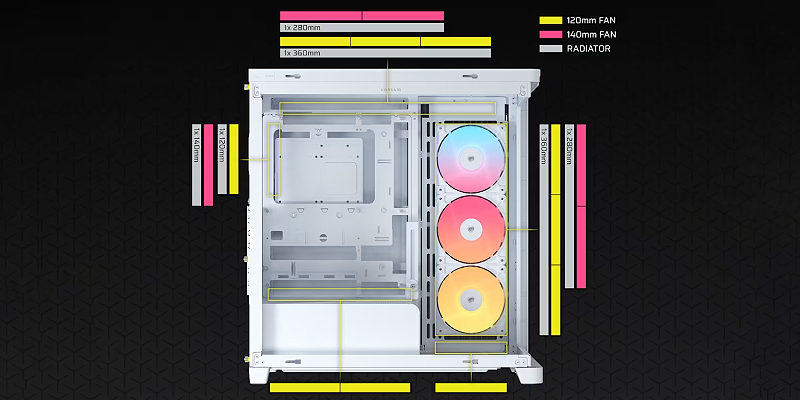 מערכת ההרכבה החדשנית InfiniRail למאווררים לבנייה קלה, ותמיכה כפולה ברדיאטורים בגודל 360 מ"מ.