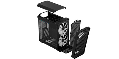 Transparently easy Seamless tempered glass panels with bolt-free top-latching mechanisms for easy handling LED lights (TG versions) and RGB fans (RGB version) are fully controllable through motherboards supporting addressable RGB (5V) Top mounted aerodynamic PSU shroud with integrated ARGB effects (ARGB strip only available on TG and RGB versions) |