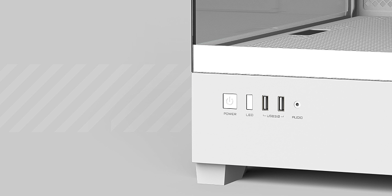 בלוח החיבורים הקדמי תמצאו שני חיבורי USB 3.0, שקע אודיו, מתג RGB LED, וכפתור הפעלה לנגישות נוחה לכל הפונקציות החיוניות ולשליטה בתאורה.