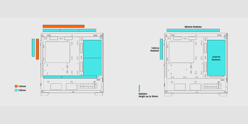 תומך בעד תשעה מאווררי 120 מ"מ ומאוורר אחורי בגודל 140 מ"מ, בנוסף לרדיאטורים בגודל 360 מ"מ למעלה ו־240 מ"מ בצד הימני,