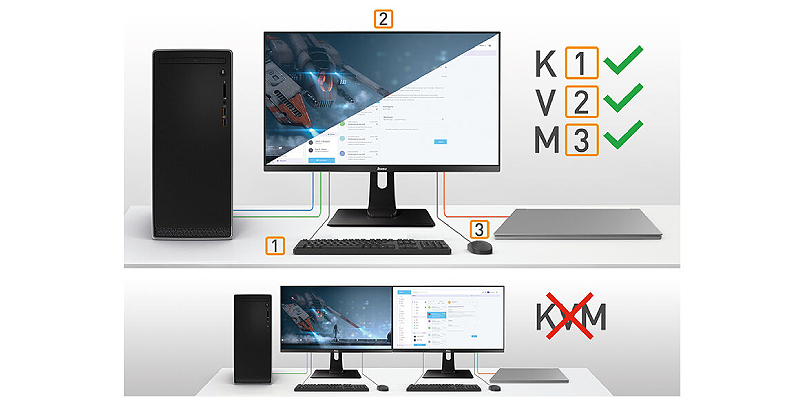 מסך עם מתג KVM מאפשר לשתף התקני USB המחוברים למסך בין שני מחשבים שונים.