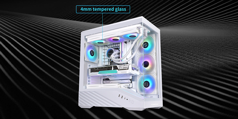 הפנלים הקדמיים והצדדיים עשויים מזכוכית מחוסמת בעובי 4 מ"מ, למראה מודרני ונקי – אידיאלי להבלטת הרכיבים הפנימיים.