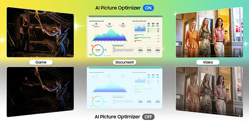 ממטב התמונה מבוסס ה-AI מתאים את התצוגה כך שתוכלו לעבוד בנוחות על מסמכים, להתעמק במשחקים עם שחורים עמוקים ועשירים, ולצפות בסרטונים בצבעים חיים ותוססים.