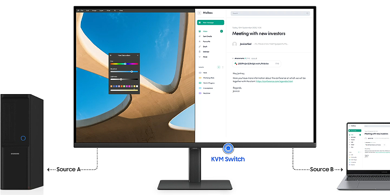 מתג KVM מובנה מאפשר לחבר ולשלוט בשני מקורות בו זמנית באמצעות מקלדת ועכבר אחד בלבד.