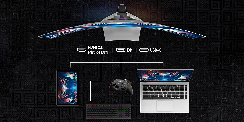 גישה למגוון אפשרויות חיבור כולל HDMI 2.1, Micro HDMI, DisplayPort, USB-C כניסה ויציאה.