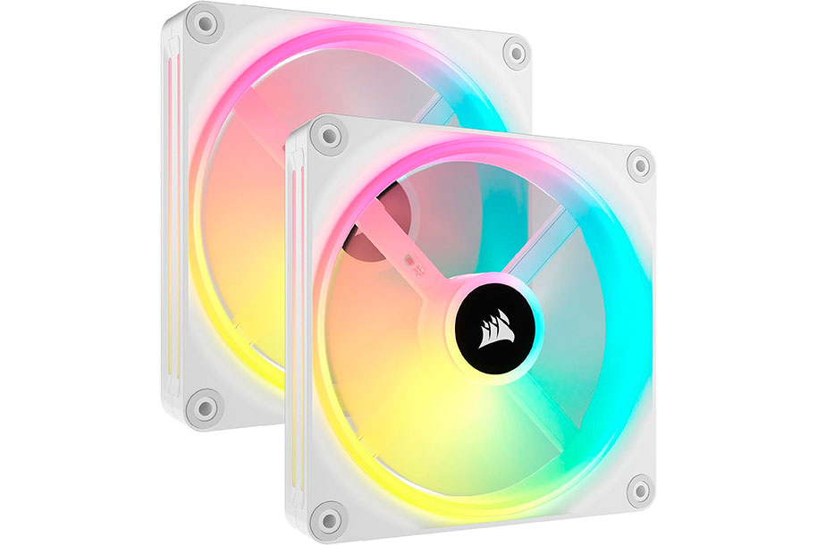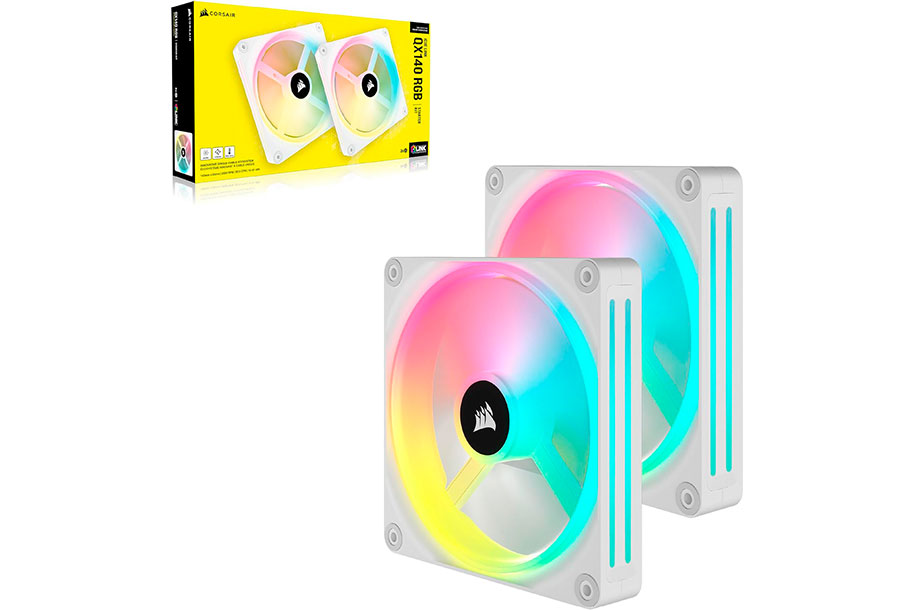 Corsair iCUE LINK QX140 RGB 140mm PWM White Fans x2 Starter Kit CO-9051008-WW contains two fans each with four distinct light loops and an included iCUE LINK System Hub for single cable setup.