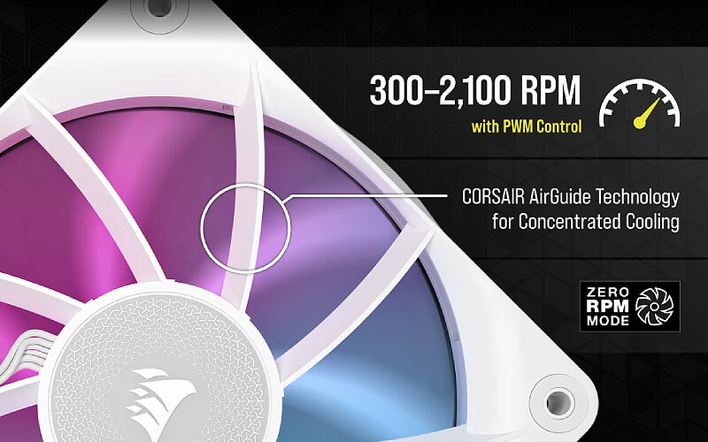 CORSAIR AIRGUIDE - להבי המאוורר מכוונים בזווית כדי למקד את חרוט זרימת אוויר הפליטה ולשפר את הכיסוי של סנפירי הרדיאטור ופיזור החום.