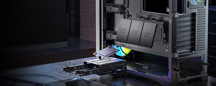 תומך בעד 5 כוננים: 2 מגשי כונן נשלפים עבור "3.5 HDD או 2.5" SSD ו-3 מגשים עבור "2.5 SSD.