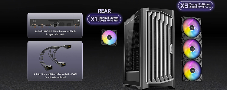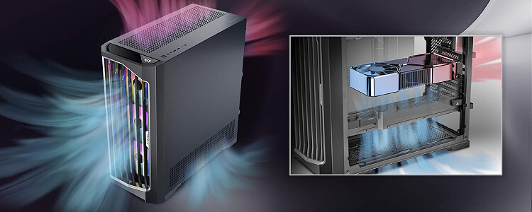 רשת בתחתית ובצד ימין למטה, והזמינות של מאווררים המותקנים על מעטפת ספק הכוח מספקים יחד את הביצועים הטובים ביותר לקירור ה-GPU.