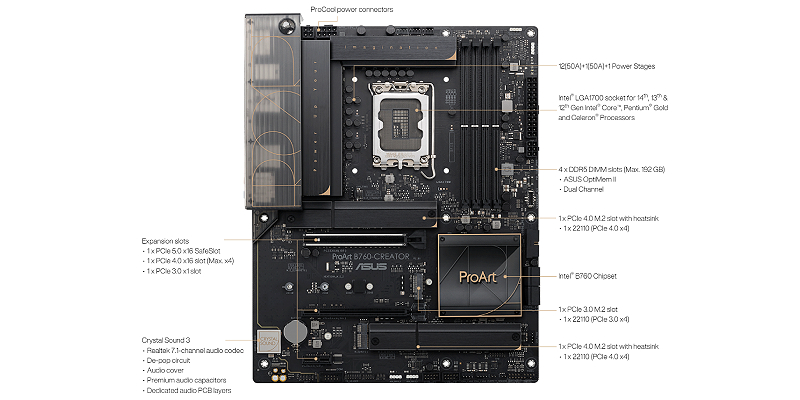 ה-ProArt B760-Creator הוא לוח אם מתקדם שתוכנן במיוחד עבור עומסי עבודה של יוצרים – כגון הפקות וירטואליות, רינדור תלת-ממד ועריכת וידאו באיכות 4K/8K.