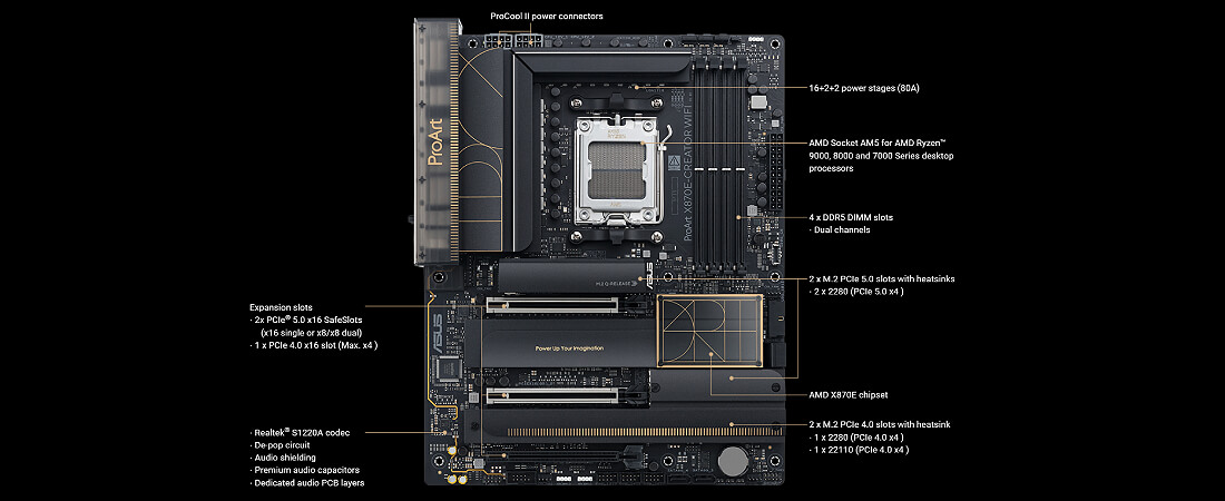 ה-ProArt X870E-Creator WiFi מעצים יוצרים מכל הרמות על ידי מקסום הביצועים של מעבדי AMD Ryzen™ 9000, 8000 ו-7000 העדכניים ביותר