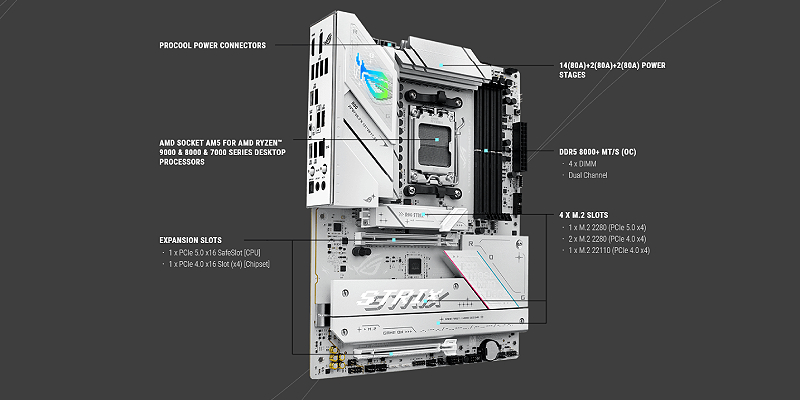 כולל PCB לבן מלוטש ותמיכה במעבדי AMD Ryzen™ 9000 Series, לוח אם זה מספק את הכוח והקישוריות הדרושים ליישומי AI מתקדמים.