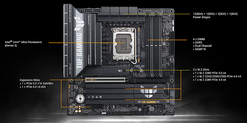 ה-ASUS TUF GAMING B860M-PLUS WIFI לוקח את כל האלמנטים החיוניים של מעבדי Intel® Core™ Ultra העדכניים ביותר (סדרה 2) ומשלב אותם עם תכונות מוכנות למשחק ועמידות מוכחת.