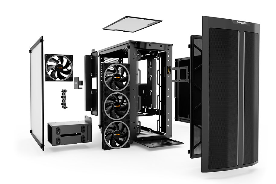 The PSU shroud perfectly covers the cables and PSU. It also contains a double HDD cage with decoupled mountings that reduce vibrations and help maximize the silence. The cage can also be repositioned to install a radiator of up to 360mm at the front. The power supply unit can be easily installed from behind, mounted on the provided PSU bracket.