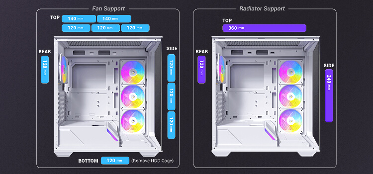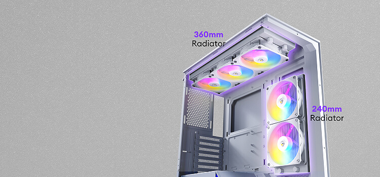 תומך בו זמנית ברדיאטור עליון בגודל 360 מ"מ ורדיאטור צדדי בגודל 240 מ"מ.