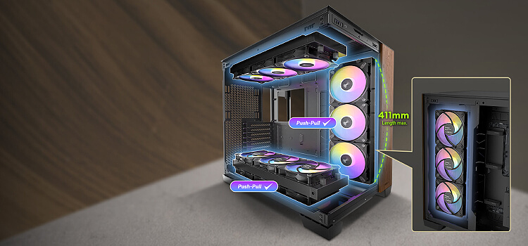 יכול להכיל שלושה מאווררים בגודל 120 מ"מ/140 מ"מ או שני מאווררים בגודל 160 מ"מ כל אחד מלמעלה ולמטה לקירור GPU יעיל.