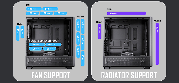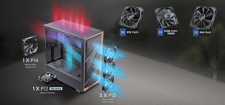 Included Fans PWM: Front 3x120mm & Reverse on PSU Shroud 1x120mm & Rear 1x140mm