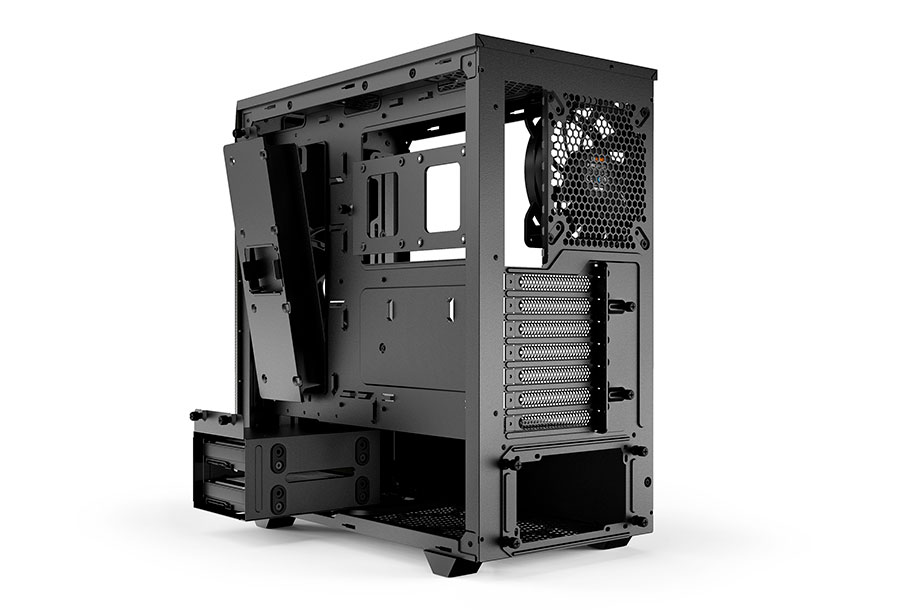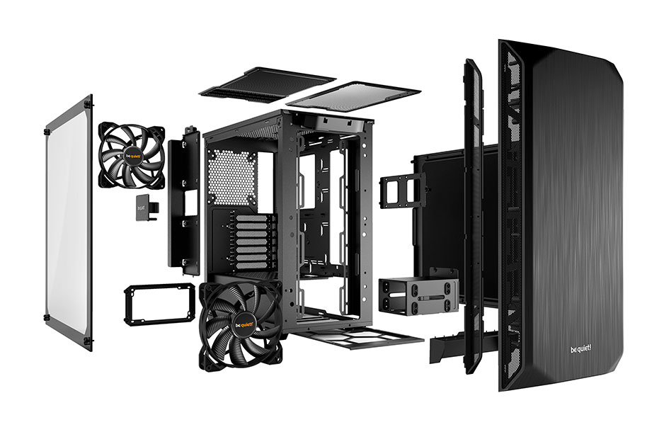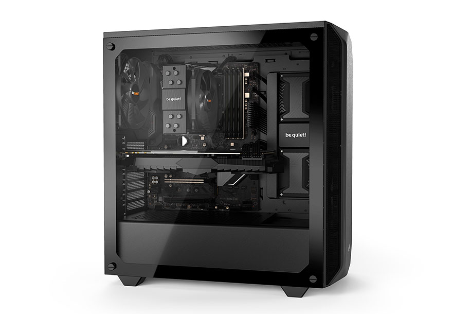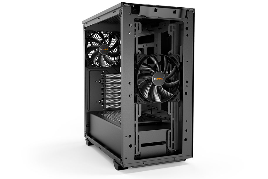 Two preinstalled Pure Wings 2 fans with airflow-optimized fan blades that ensure perfect airflow and cooling. Despite the compact case design the front and rear fans are both 140mm models, resulting in very quiet operation. Up to three 140mm fans can be installed in addition.