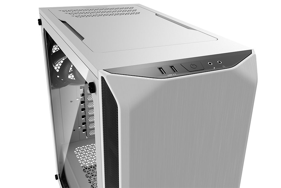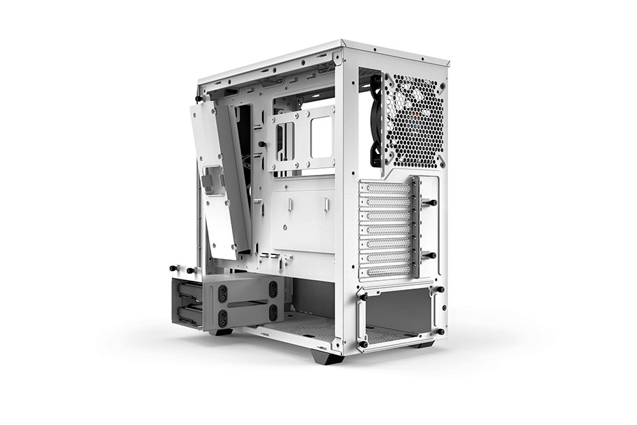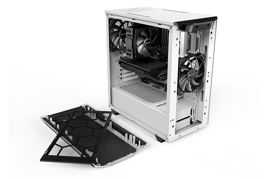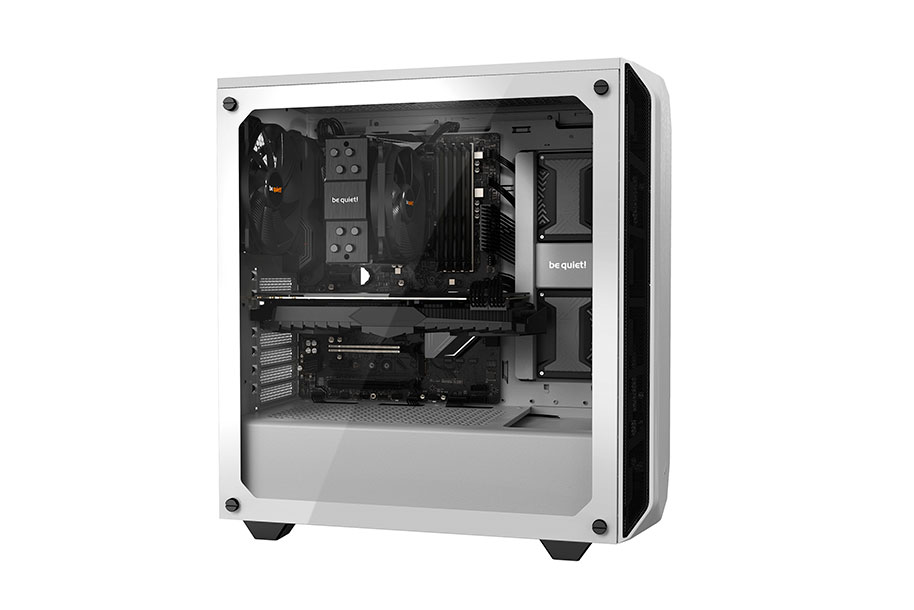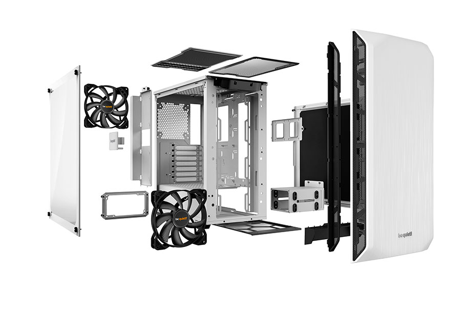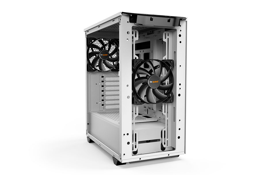 Two preinstalled Pure Wings 2 fans with airflow-optimized fan blades that ensure perfect airflow and cooling. Despite the compact case design the front and rear fans are both 140mm models, resulting in very quiet operation. Up to three 140mm fans can be installed in addition.
