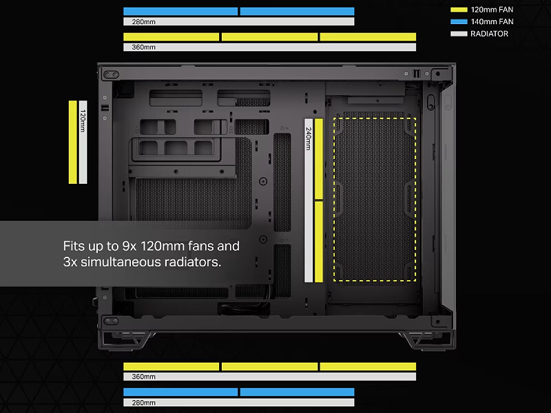 התאם אישית את מערך הקירור שלך עם מקום ל-9 מאווררים בגודל של 120 מ"מ או ל-6 מאווררים בגודל של 140 מ"מ, כולל אפשרויות הרכבה של רדיאטור עד 240 מ"מ בצד, ועד 360 מ"מ בגג ובתחתית.