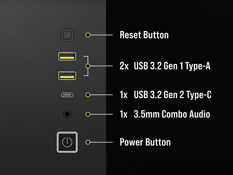 החיבורים שלך בהישג יד, עם יציאת USB 3.2 Gen 2 Type-C ו-2 יציאות USB 3.2 Gen 1 Type-A בנוסף ליציאת מיקרופון ושמע משולבת.
