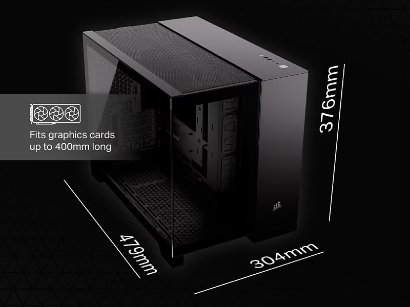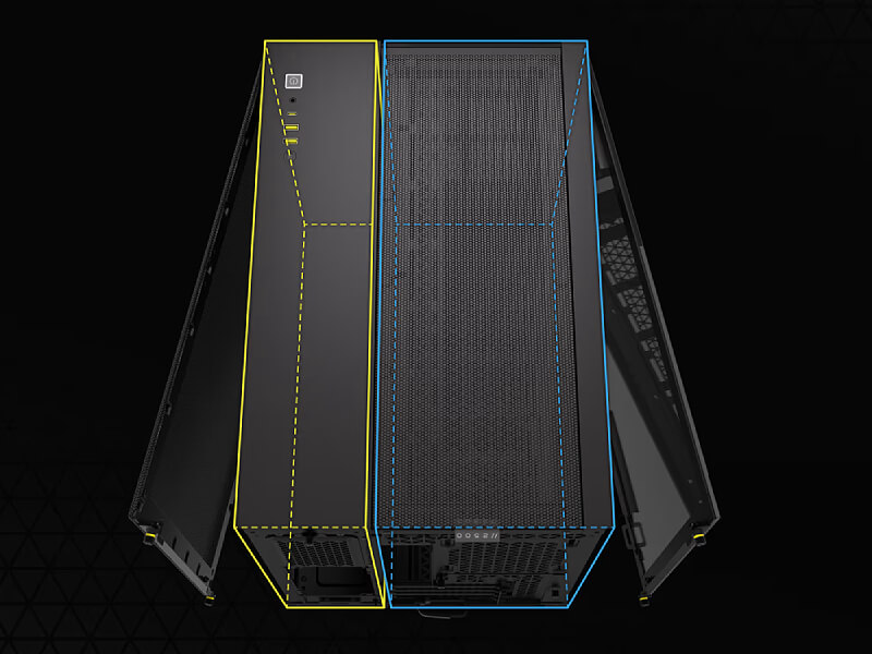 הצג את הבנייה הנקיה והמאורגנת שלך בתא אחד המצויד במגוון תושבות מאווררים ורדיאטורים, תוך הסתרת הכבלים, כונני האחסון וספק הכוח בתא השני.