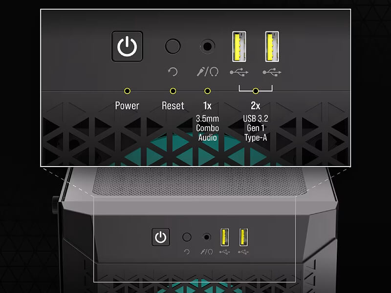 החיבורים שלך בהישג יד עם פאנל I/O קדמי הכולל 2x יציאות USB 3.2 Gen 1 Type-A, שקע מיקרופון ושקע אודיו.