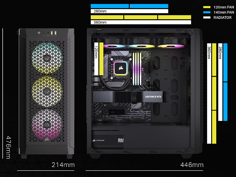 ה-CORSAIR 480T RGB הוא מארז mid-tower ATX ייחודי עם חלל פנימי מרווח, פאנל קדמי המאפשר זרימת אוויר גבוהה, וזכוכית מחוסמת ויפה כדי שתוכל להשוויץ בשלושה מאווררי ה-AR120 RGB הכלולים.
