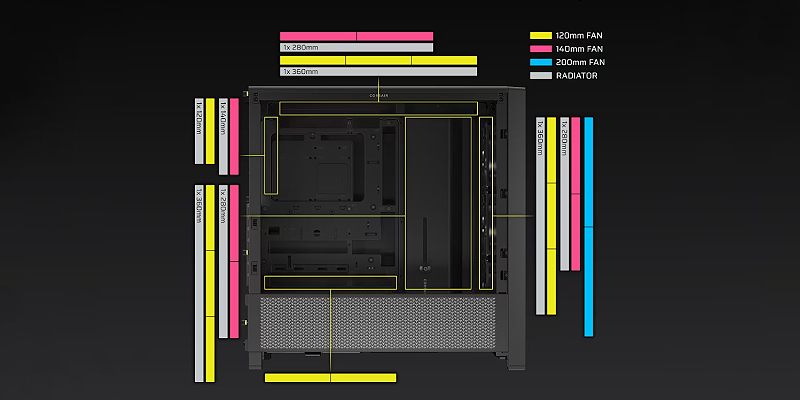 שדרגו את יכולות הקירור שלכם עם שלושה אזורים ייעודיים להתקנת רדיאטורים בגודל 360 מ"מ – בחזית, בגג ובצד.