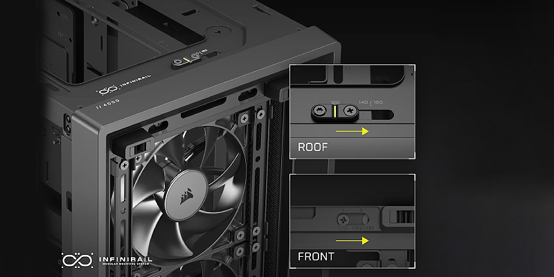 המארז Corsair FRAME 4000D RS הוא מארז מודולרי ומרווח במיוחד הכולל את מערכת התקנת המאווררים InfiniRail ותואם ללוחות אם עם חיבורים הפוכים (reverse connector).