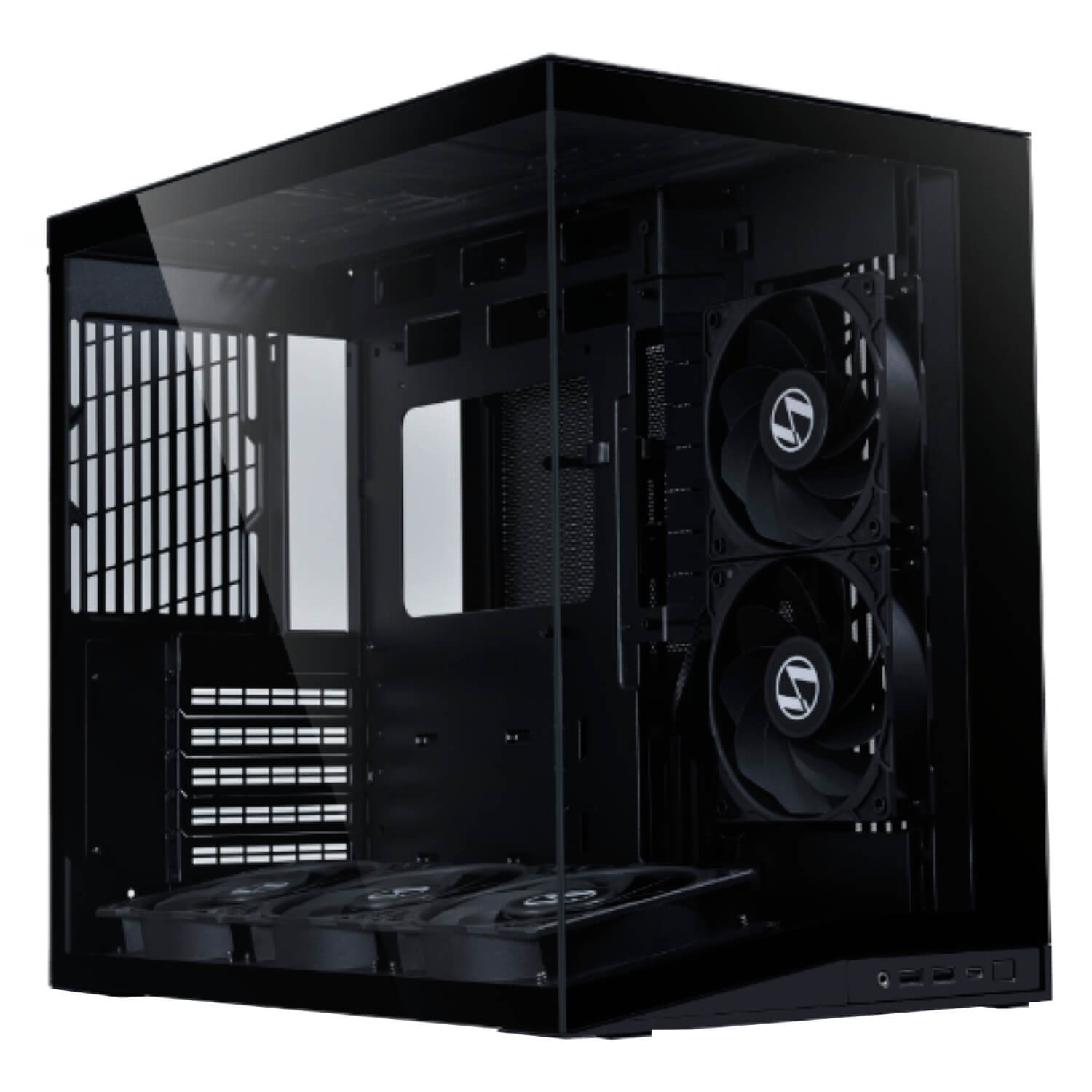מארז מחשב O11 Dynamic Mini V2 Flow מבית Lian-Li, בצבע שחור, משלב קירור חכם, גמישות מודולרית ועיצוב נקי ואלגנטי במבנה אחד, מגיע עם 5 מאווררי PWM Reverse בגודל 120 מ"מ מותקנים מראש. O11DMIV2FX