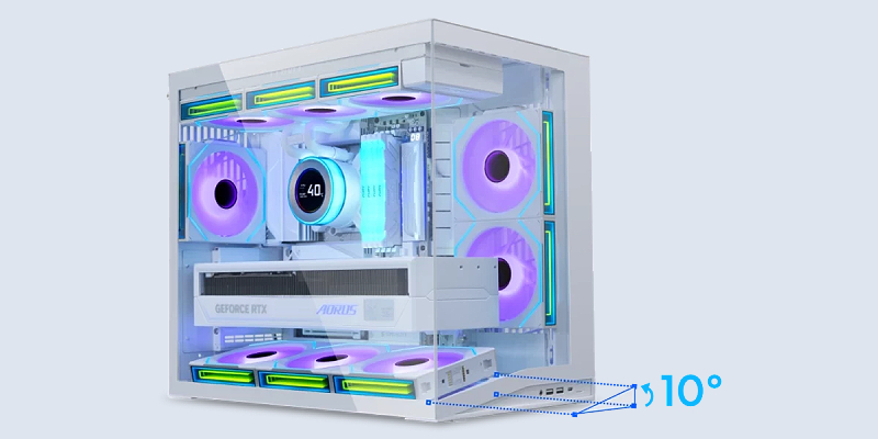 תחתית בזווית של 10° מנתבת אוויר קר ישירות אל כרטיס המסך, לשיפור הביצועים התרמיים ולמראה נקי יותר.