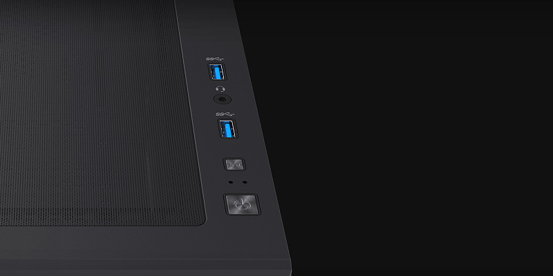 כולל שני חיבורי USB 3.0, חיבורי אודיו, כפתור איפוס וכפתור הפעלה.