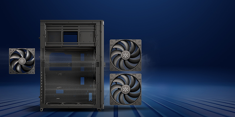 המארז כולל שני מאווררי יניקה בגודל 180 מ"מ של SilverStone ומאוורר פליטה אחורי בגודל 140 מ"מ,