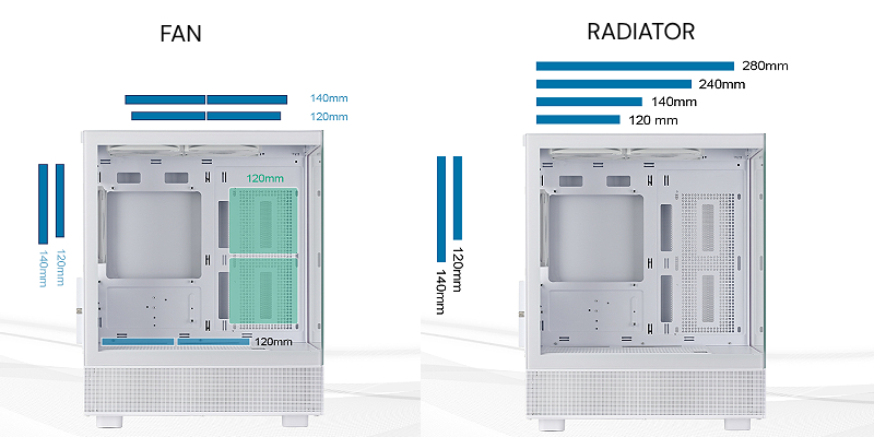 התא העליון תומך גם ברדיאטור לקירור מים בגודל 280 מ"מ לפיזור חום יעיל.