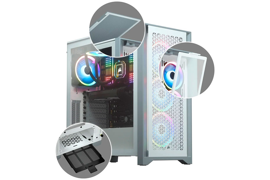Equipped with two CORSAIR 120mm AirGuide fans, utilizing anti-vortex vanesTo concentrate airflow and enhance cooling.