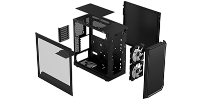 | Airflow in focus Innovative interior layout for optimal airflow and an enjoyable building experience Comes with two of our 140 mm Aspect fans (With or without RGB depending on version) Sleek and easy-to-clean front mesh acts as a dust filter while allowing high airflow Space for up to six 120 mm fans or four 140 mm fans |