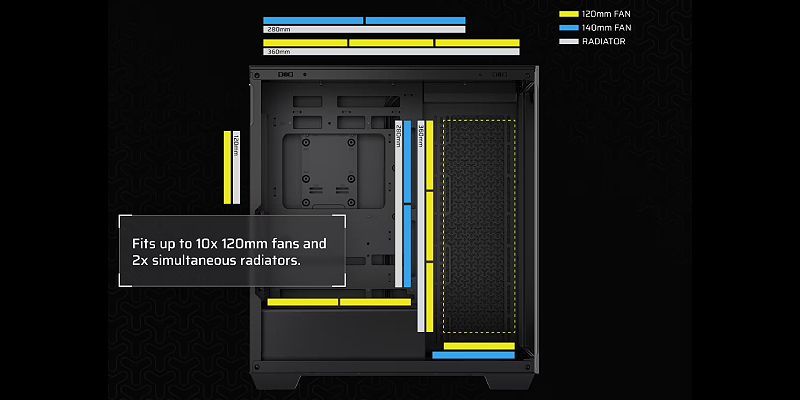 התאם אישית את מערך הקירור שלך עם מקום ל-10 מאווררים בגודל של עד 120 מ"מ, בתוספת אפשרויות מגוונות להרכבה של רדיאטור עד 360 מ"מ בצד ובגג.