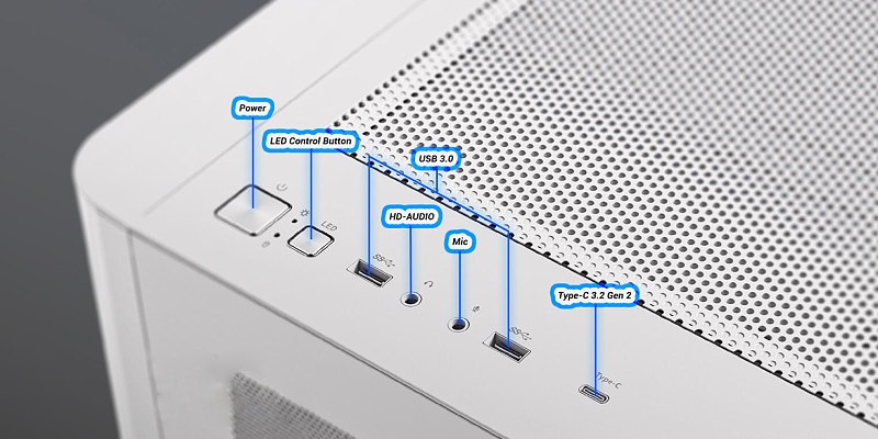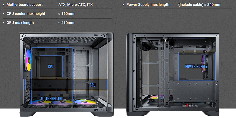 פאנלים מזכוכית מחוסמת בעיצוב קעור מציעים תצוגה פנורמית חלקה ואלגנטית, שמדגישה את מראה רכיבי המערכת שלך.