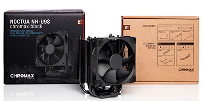 | The NH-U9S chromax.black is an all-black version of Noctua’s award-winning NH-U9S premium-quality quiet CPU cooler. Thanks to the same proven compact 92mm tower heatsink design and NF-A9 PWM fan, it stays true to the NH-U9S’s successful formula of fusing strong cooling performance with excellent quietness of operation and outstanding RAM, case and PCIe compatibility. At the same time, the chromax.black version with its black fan and black coated heatsink combines these assets with a sleek stealth look. | ![]() |