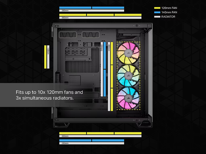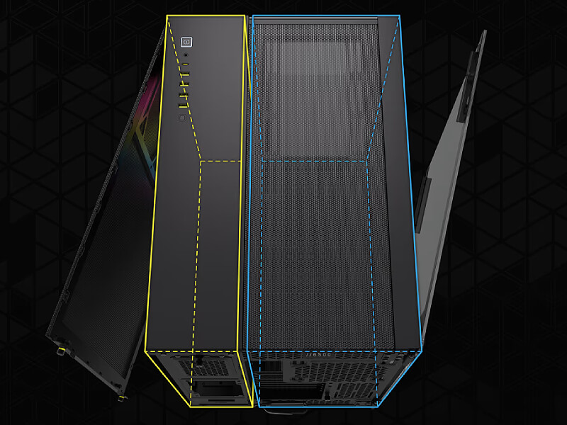 הצג את הבנייה הנקיה והמאורגנת שלך בתא אחד המצויד במגוון תושבות מאווררים ורדיאטורים, תוך הסתרת הכבלים, כונני האחסון וספק הכוח בתא השני.