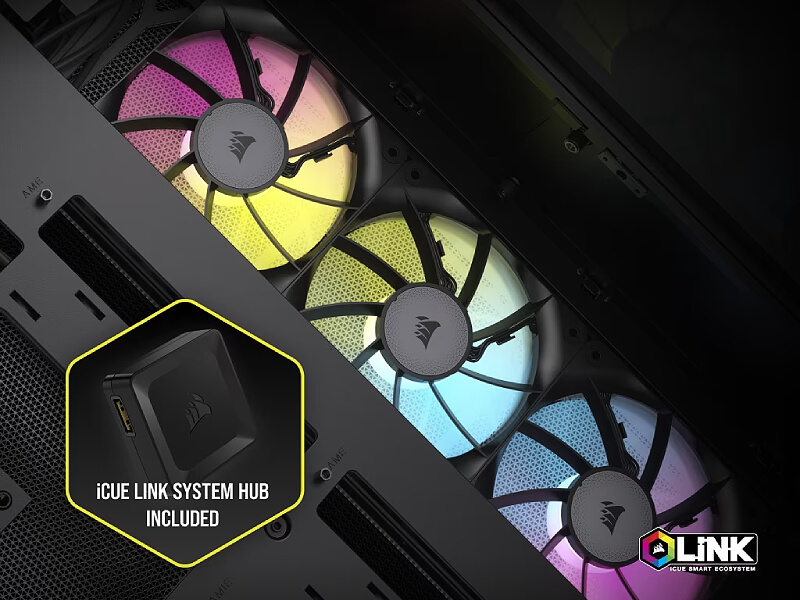 מגיע עם חבילת מאווררי iCUE LINK (3x מאווררי RX RGB ורכזת System Hub).