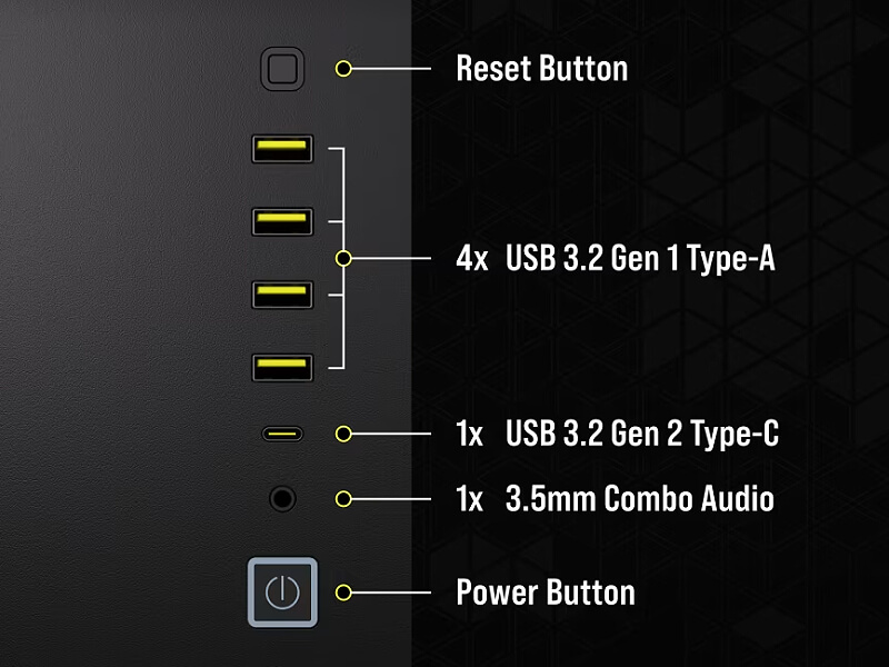 החיבורים שלך בהישג יד, עם יציאת USB 3.2 Gen 2 Type-C ו-4 יציאות USB 3.2 Gen 1 Type-A בנוסף ליציאת מיקרופון ושמע משולבת.