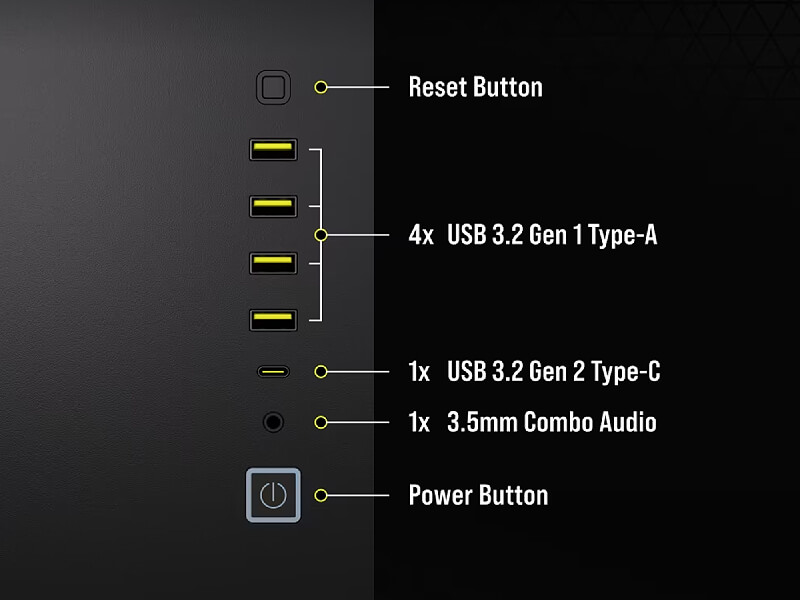 החיבורים שלך בהישג יד, עם יציאת USB 3.2 Gen 2 Type-C ו-4 יציאות USB 3.2 Gen 1 Type-A בנוסף ליציאת מיקרופון ושמע משולבת.